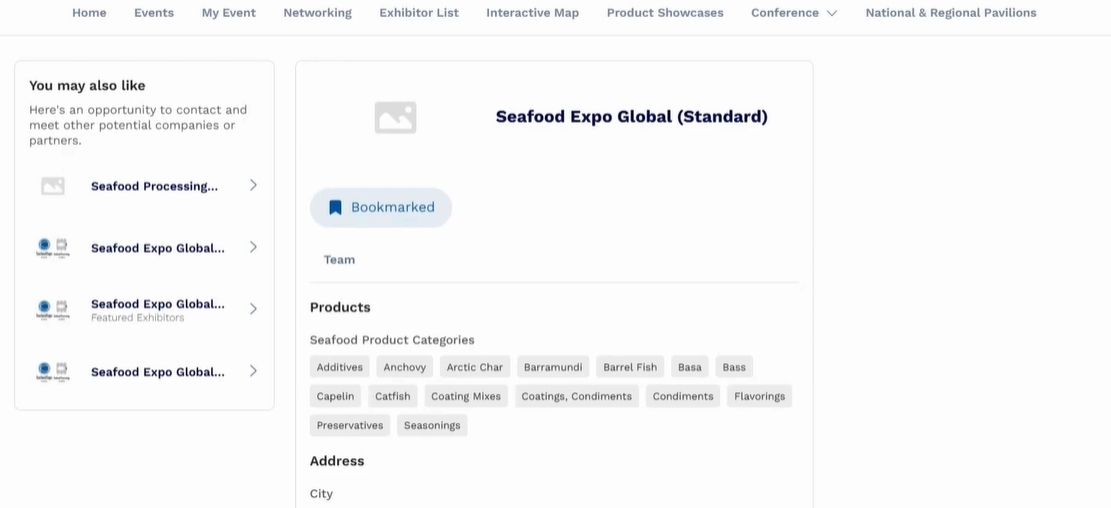 Company name, stand number, city, state, country, up to 15 product categories.