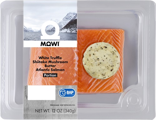 MOWI Atlantic Salmon meets the BAP certification for environmental responsibility, animal health & welfare, social accountability, food safety, and traceability. This portion comes with a White Truffle Shiitake Mushroom butter puck that marinates the salmon as it cooks. Conveniently packaged for an easy cooking experience, the White Truffle Shiitake Mushroom butter compliments the mild flavor of Atlantic Salmon for an indulgent experience.